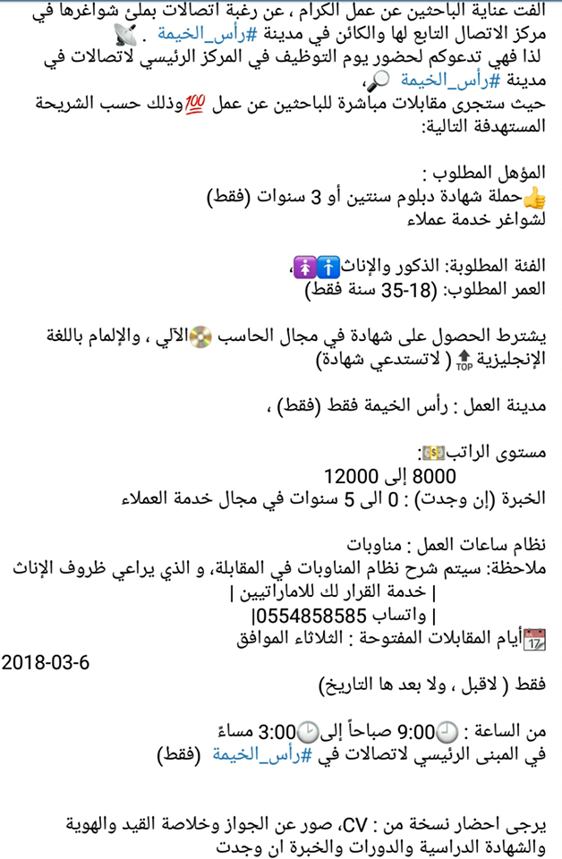 وظائف اتصالات 2018 راس الخيمة وظائف شاغرة فى الامارات